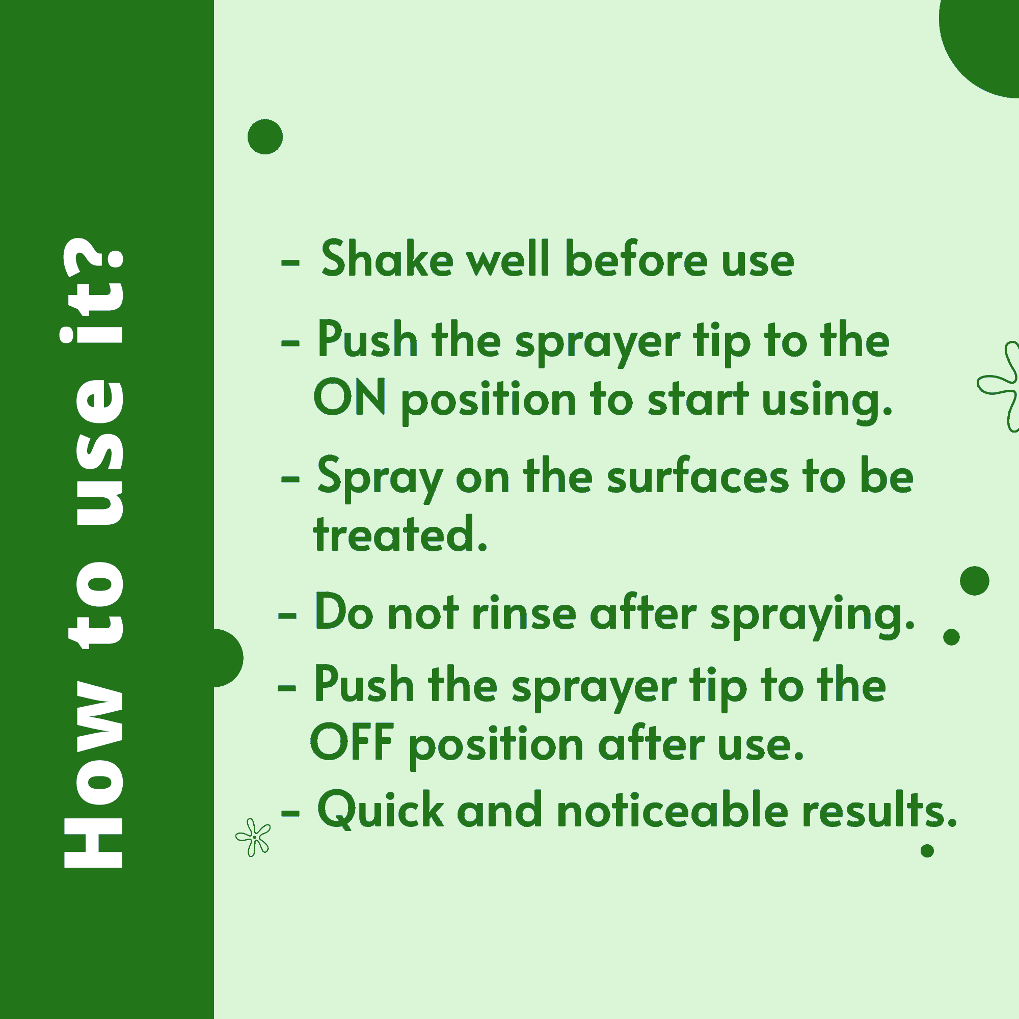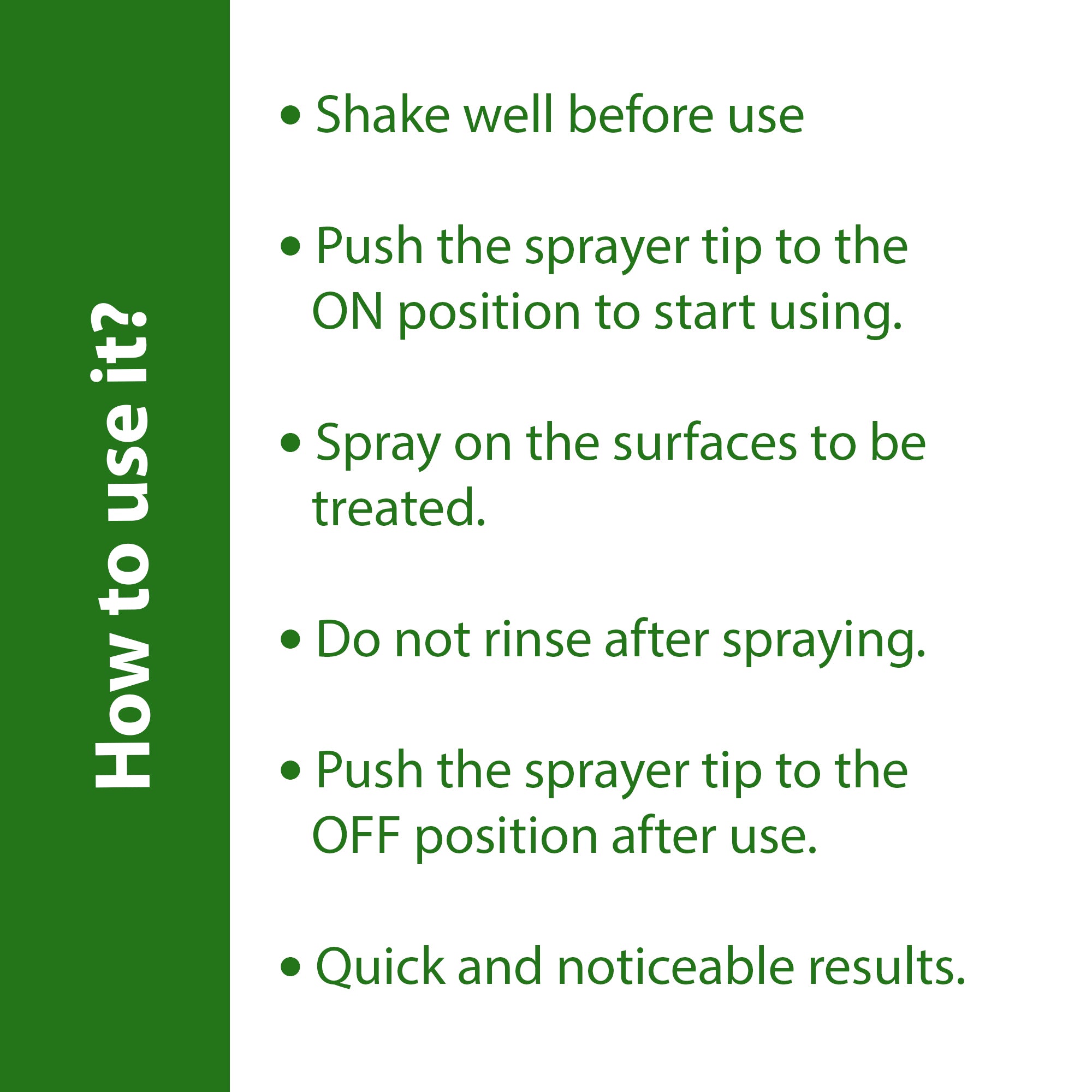 Spray on the surfaces to be treated. Do not rinse after spraying.