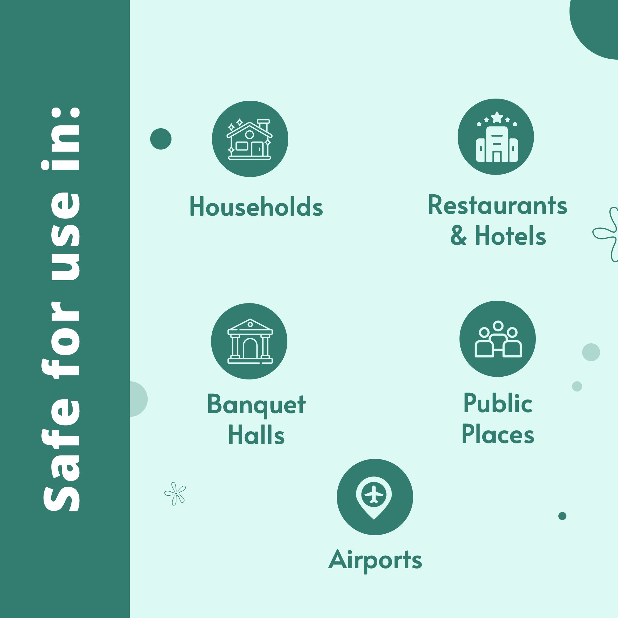 Use in households, banquets, restaurants, hotels, airports, public toilets and all other areas.