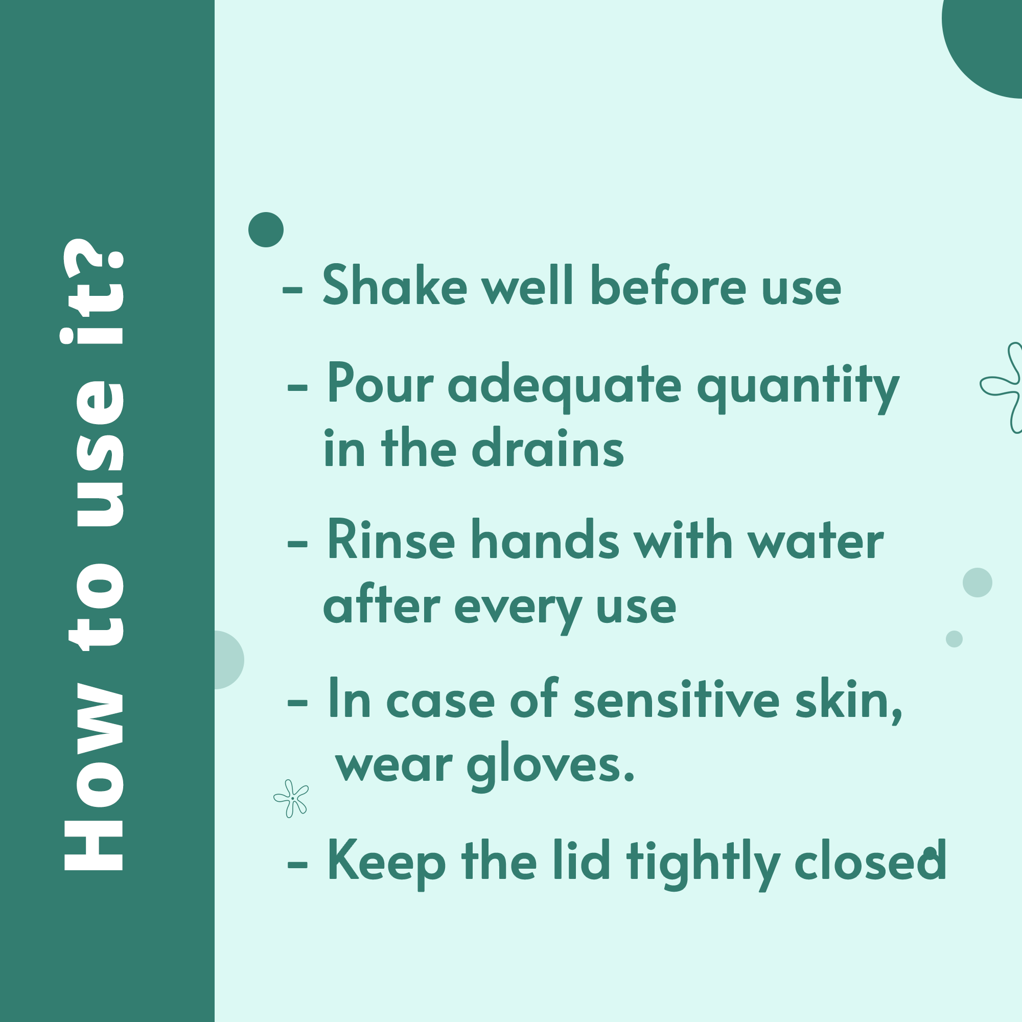 Adequate quantity to be poured in the drains.
