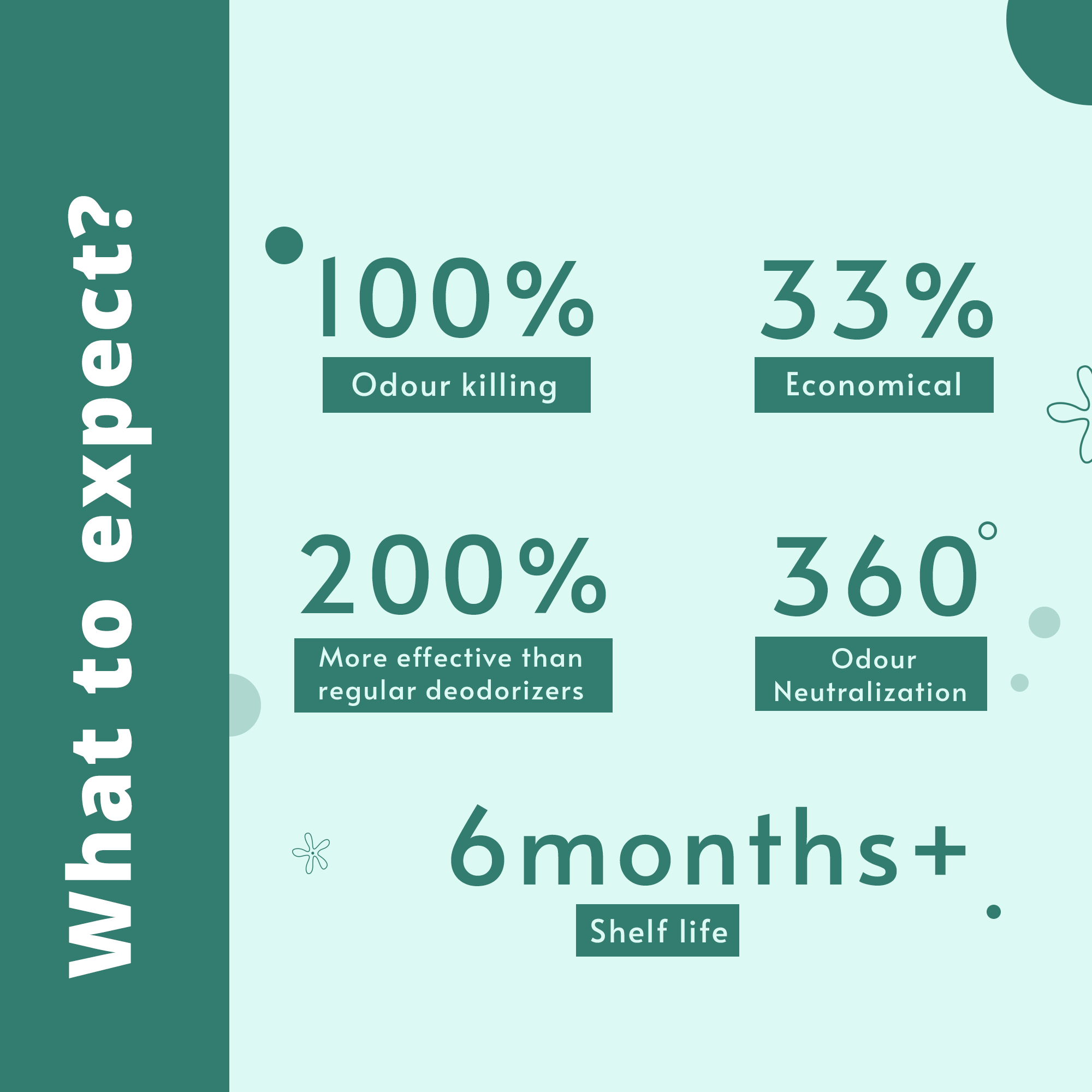 The patented active substances neutralizes unpleasant smells based on a combination of natural essentials and synthetic oils containing cocktails of aldyhedes.