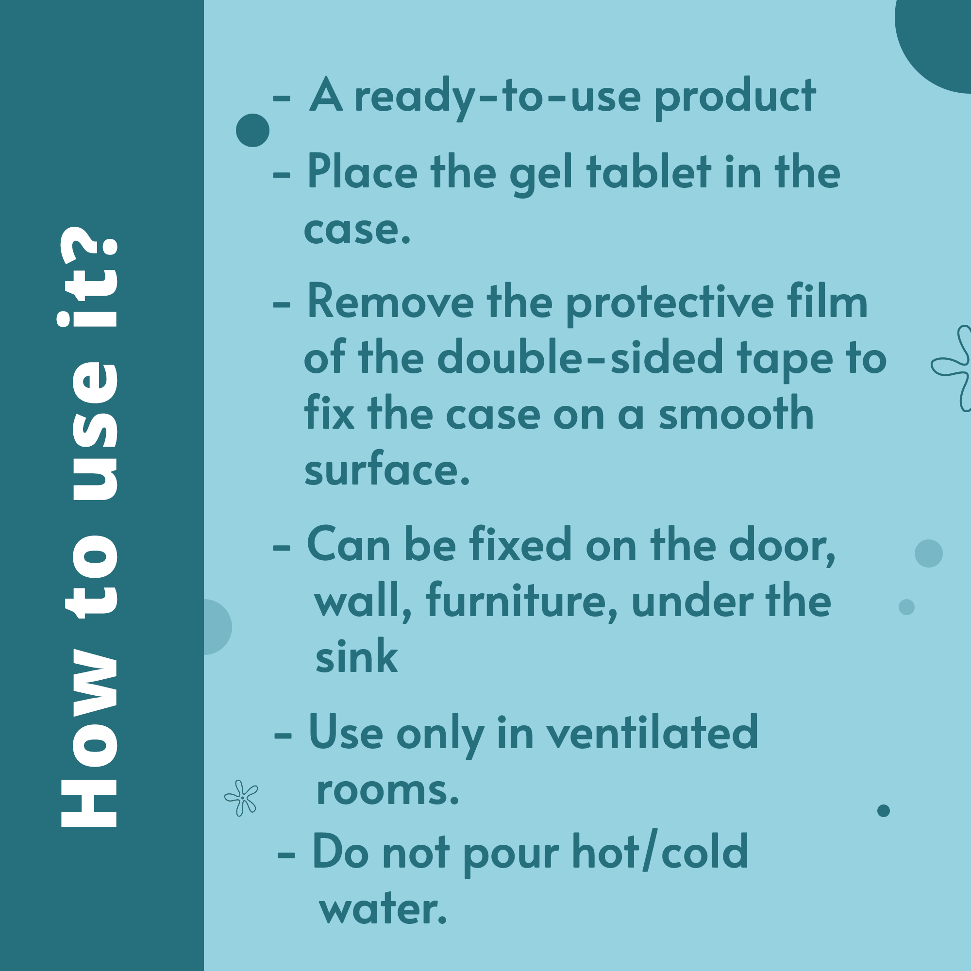 Take the case out of its protective packaging. Remove the protective film of the double-sided tape and fix the case on a clean dry and smooth surface. Can be placed on/around the door, wall, furniture, under a sink etc. To be used in washrooms. Can also be used in all small spaces where stubborn nauseating odours reign. Clean with a clean wet towel to remove the dust from time to time. Do not pour hot/cold water.