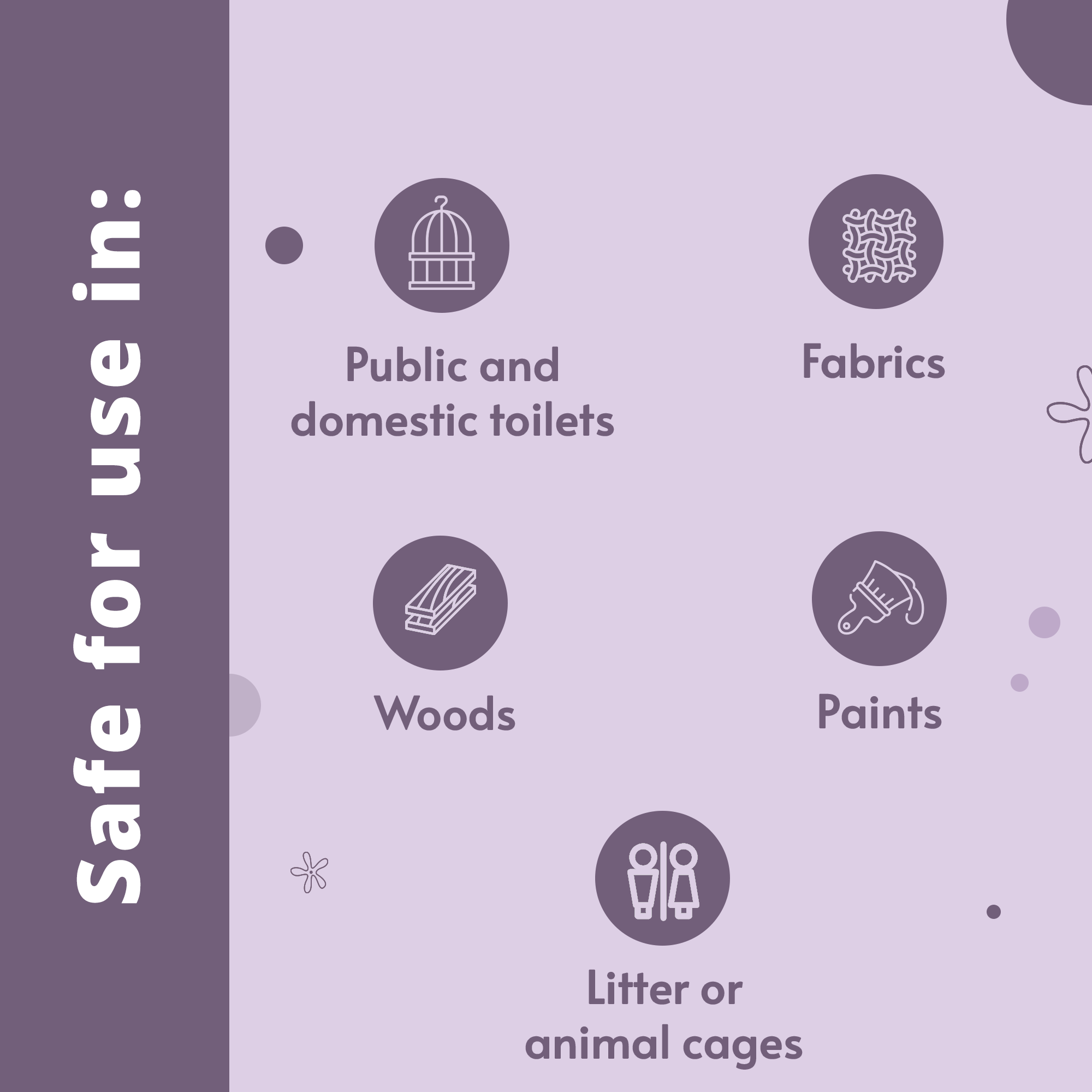 Safe for fabrics, wood or paints, a solution for litter and animal cages (without their presence). Possible for all cleaning in washing machine and carpet/carpet shampoo…
