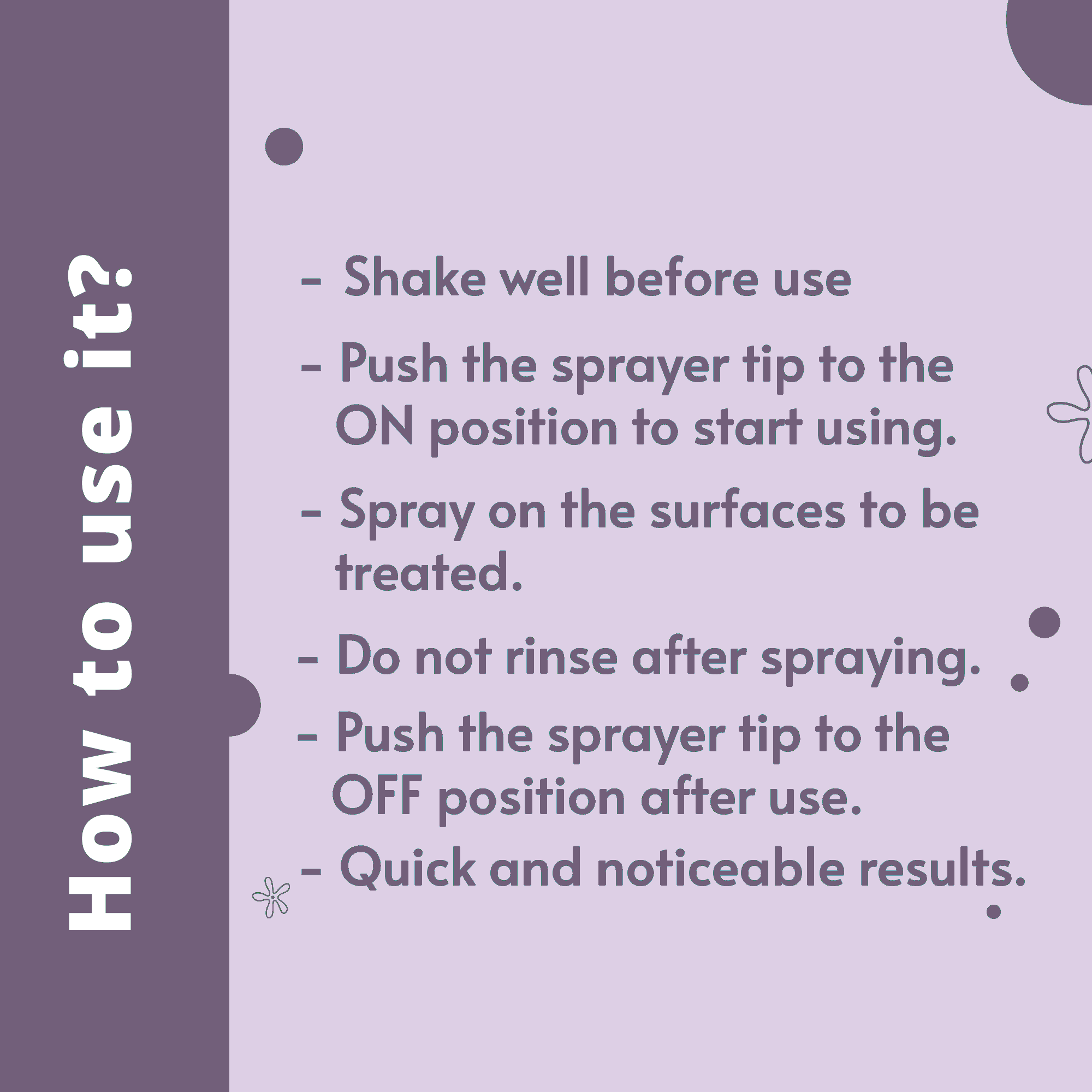 Push the button on the sprayer to the ON position to start using. Spray on the surfaces to be treated, leave on without rinsing. Put the sprayer tip in OFF position after use. Very quick and noticeable action.